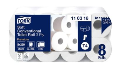 Підходить для використання в диспенсерах для туалетного паперу Tork з системою T4. Розрахований на туалетні кімнати з низькою відвідуваністю.